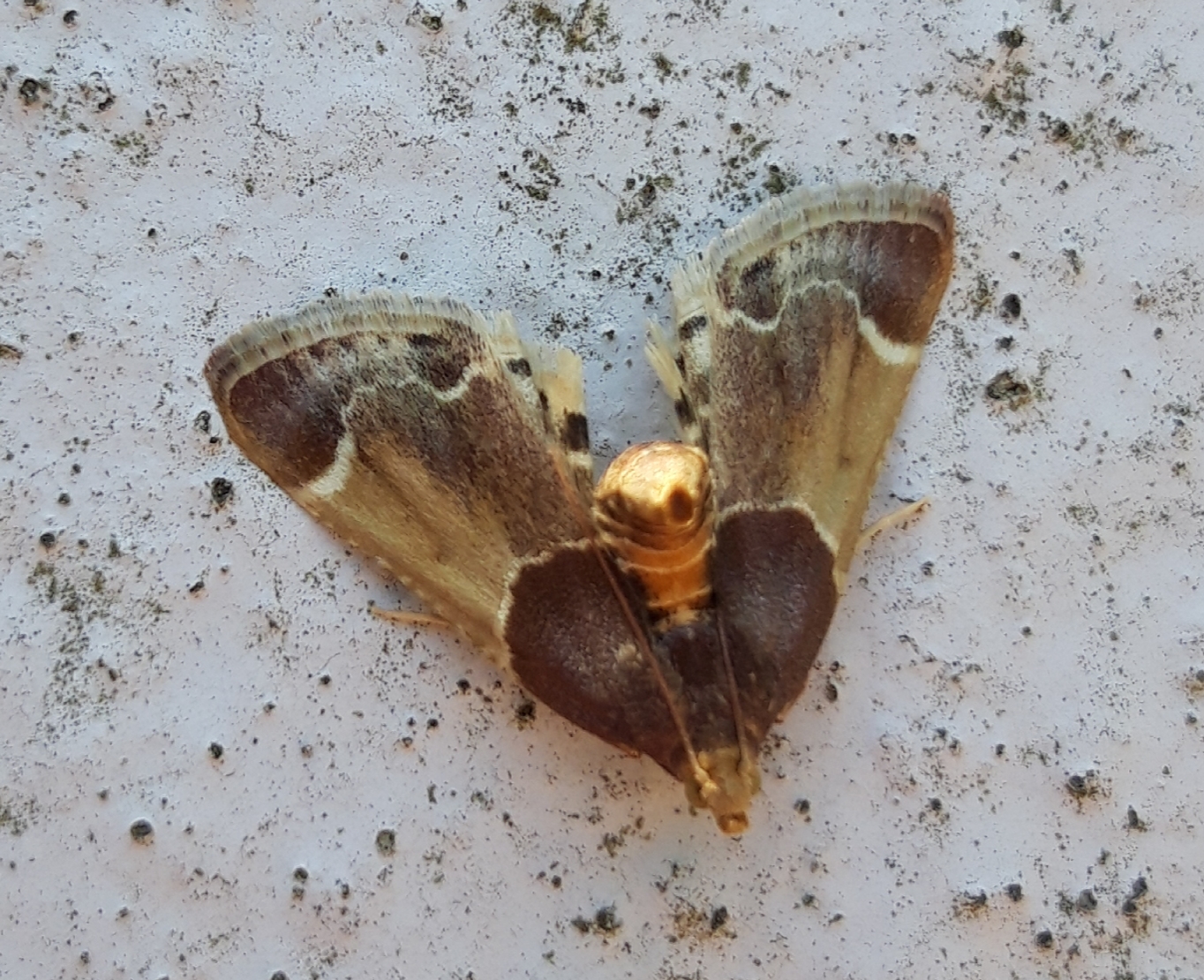 Borboleta noturna com o nome comum de Traça da farinha, foi observada em muro exterior durante o dia. Curiosamente, foi possível observar um fenómeno, sem registos, de bioluminescência intermitente localizado na zona posterior do abdómen que se encontrava em posição elevada. Estas traças da família Pyralidae são comuns em Portugal e as larvas alimentam-se de grãos, farinhas ou alimentos semelhantes.
