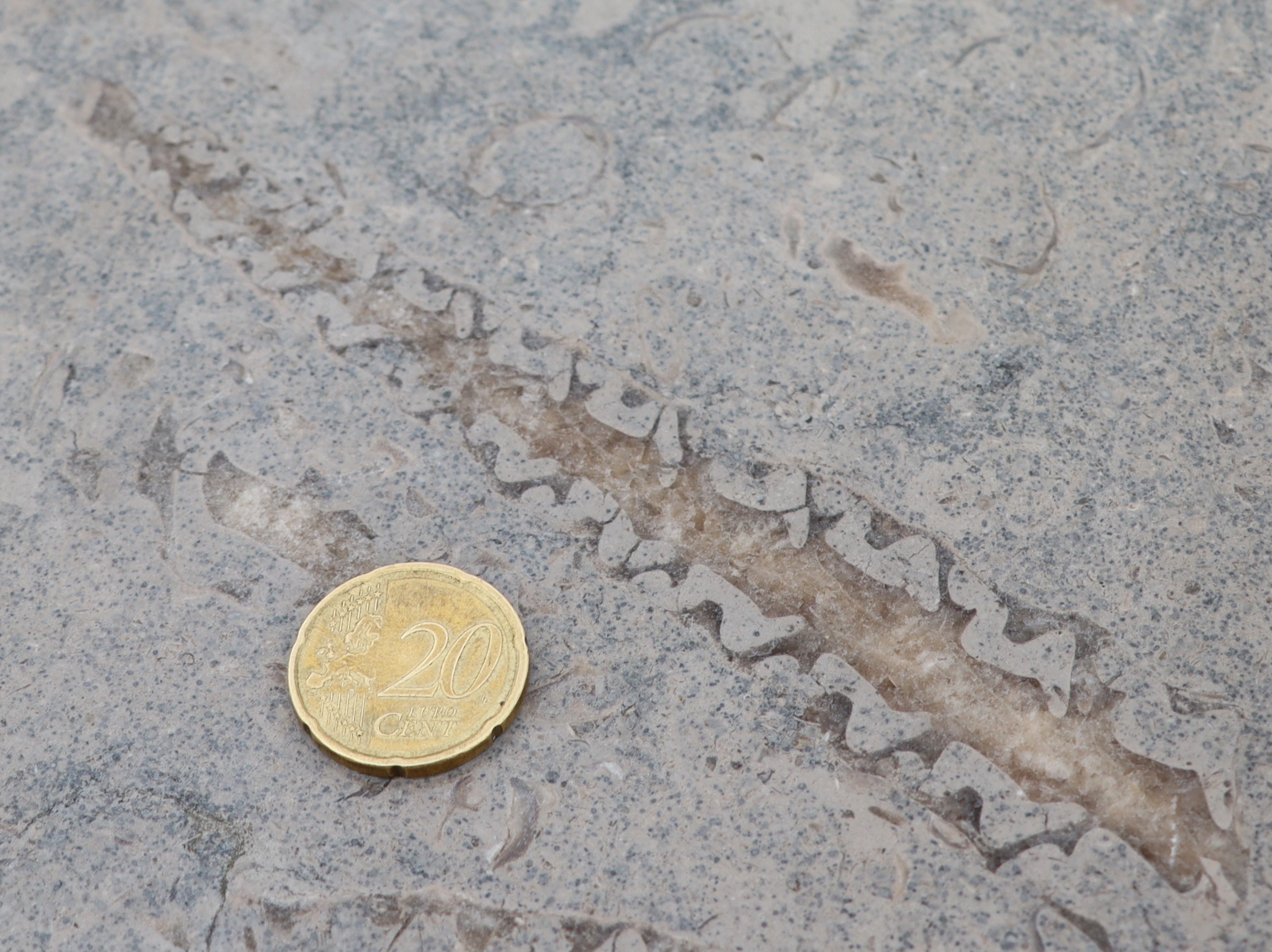 Apontamento de Paleontologia Urbana - Gastrópode marinho fossilizado em secção longitudinal