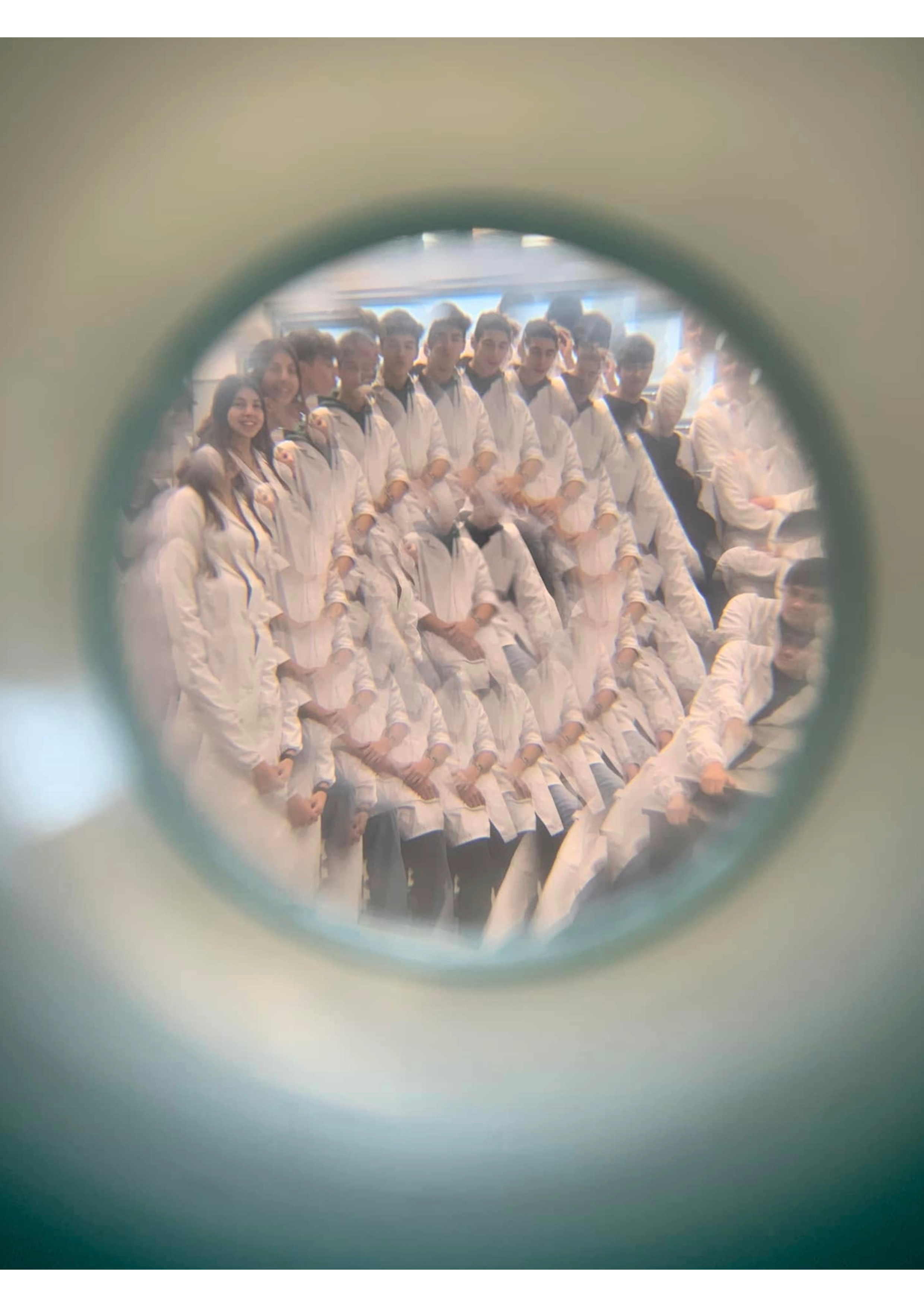 A fotografia, obtida por meio de um caleidoscópio, mostra um grupo de alunos num laboratório. O caleidoscópio — dispositivo ótico baseado em múltiplas reflexões especulares — utiliza espelhos planos dispostos com simetria angular, produzindo reflexões sucessivas que originam padrões repetitivos e simétricos. Nesta imagem, essas reflexões geram uma estrutura radial, na qual o motivo central é replicado várias vezes ao longo de um eixo de simetria, criando a perceção de multiplicidade e de ordem geométrica.