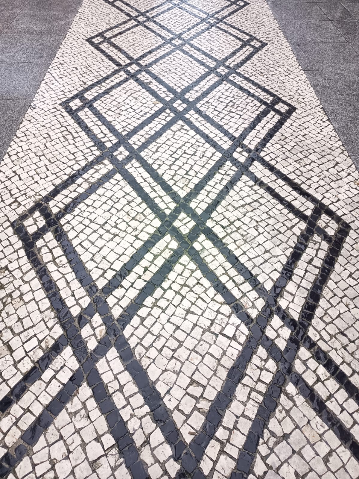 A calçada portuguesa é composta pela repetição de losangos, retângulos e quadrados, criando um padrão através de translações e simetrias. A perspetiva linear faz com que os ângulos e as áreas das formas pareçam diminuir à medida que convergem para um ponto de fuga no horizonte.