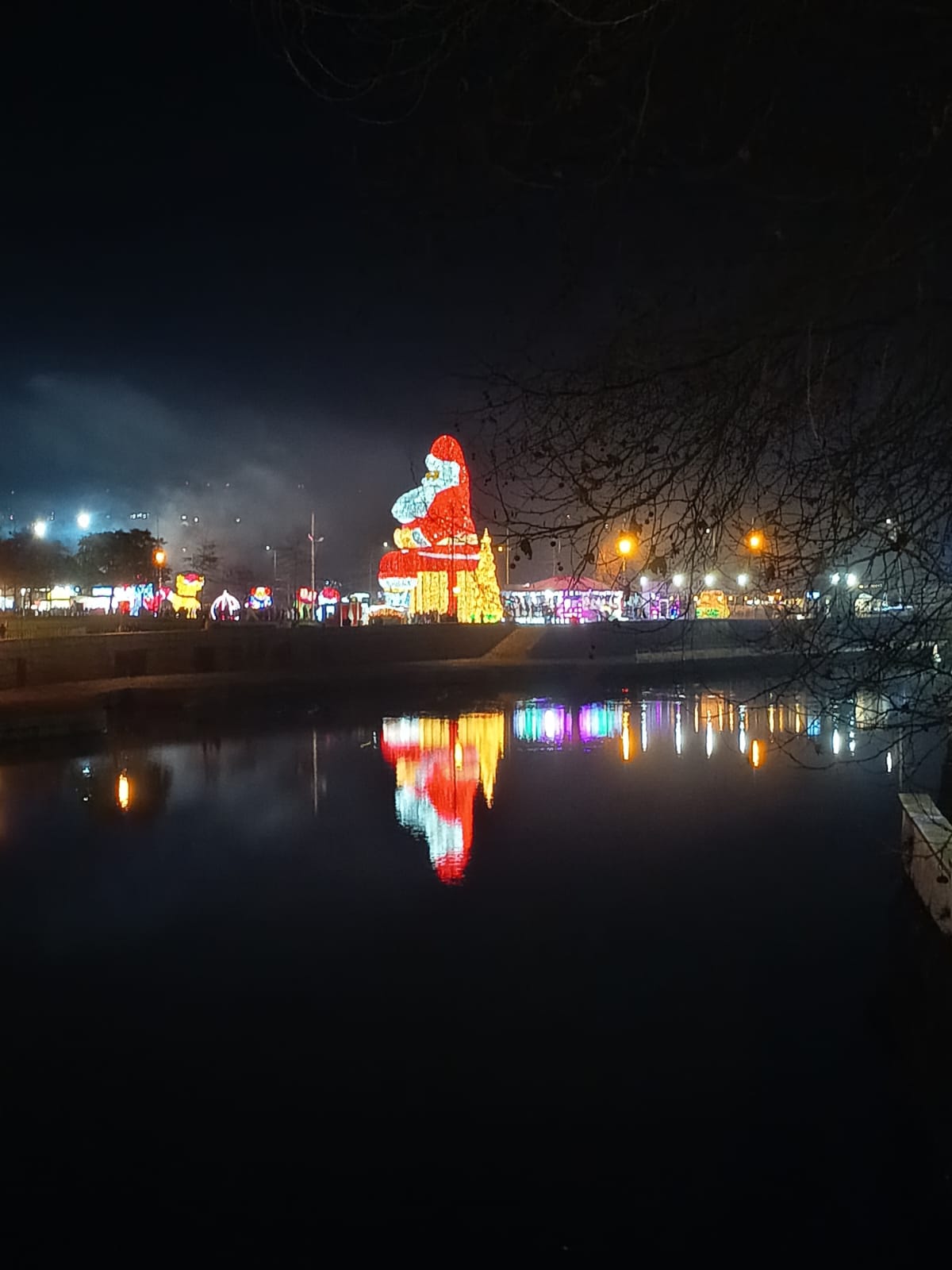 A fotografia apresenta uma cena noturna com simetria horizontal: as luzes festivas — incluindo um Pai Natal iluminado, uma árvore de Natal e figuras decorativas — refletem-se na água, criando um padrão espelhado. Destacam-se formas geométricas como cones, esferas e cilindros.
