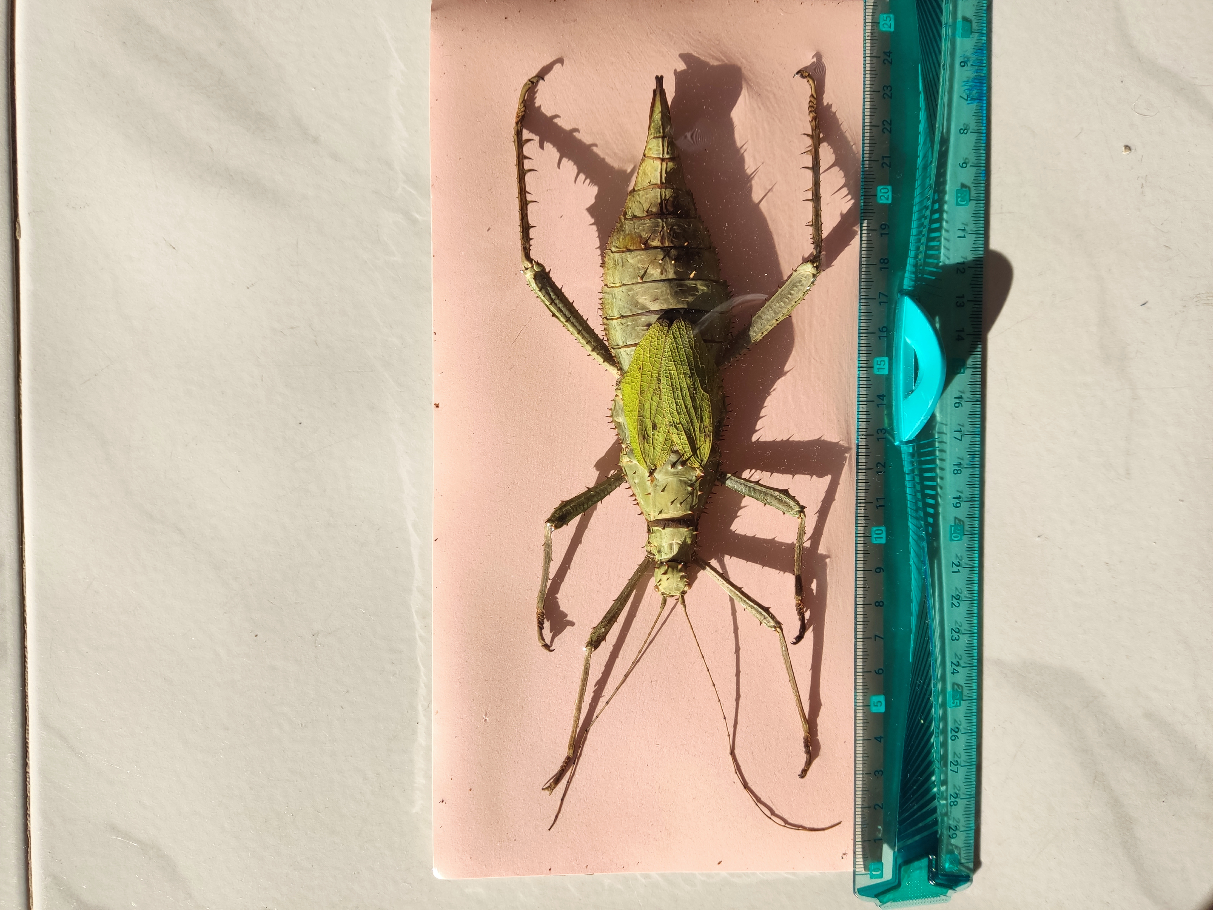 Heteropteryx dilatata (Ordem Phasmatodea) — fêmea adulta. Inseto-pau de grande porte, nativo das florestas tropicais do Sudeste Asiático, considerado um dos maiores fasmídeos conhecidos. As fêmeas podem atingir cerca de 15 cm de comprimento, apresentam corpo robusto e coloração geralmente verde. As asas são subdesenvolvidas, o que as torna incapazes de voar. A espécie apresenta dimorfismo sexual acentuado: os machos são menores, mais esguios, de coloração castanha e possuem asas plenamente desenvolvidas, que lhes permitem voar. Esta espécie alimenta-se de uma grande variedade de plantas hospedeiras, sendo considerada polifágica. O ciclo de vida é de metamorfose incompleta: dos ovos — de grandes dimensões — eclodem ninfas morfologicamente semelhantes aos adultos, que crescem através de sucessivas mudas até atingirem a maturidade, processo que pode demorar cerca de um ano. O comportamento defensivo de Heteropteryx dilatata inclui camuflagem eficaz, imobilidade prolongada e, quando perturbada, posturas intimidatórias, nas quais expõe as patas armadas de espinhos e pode produzir movimentos bruscos para dissuadir predadores. Estas estratégias aumentam significativamente a sua sobrevivência no ambiente natural.