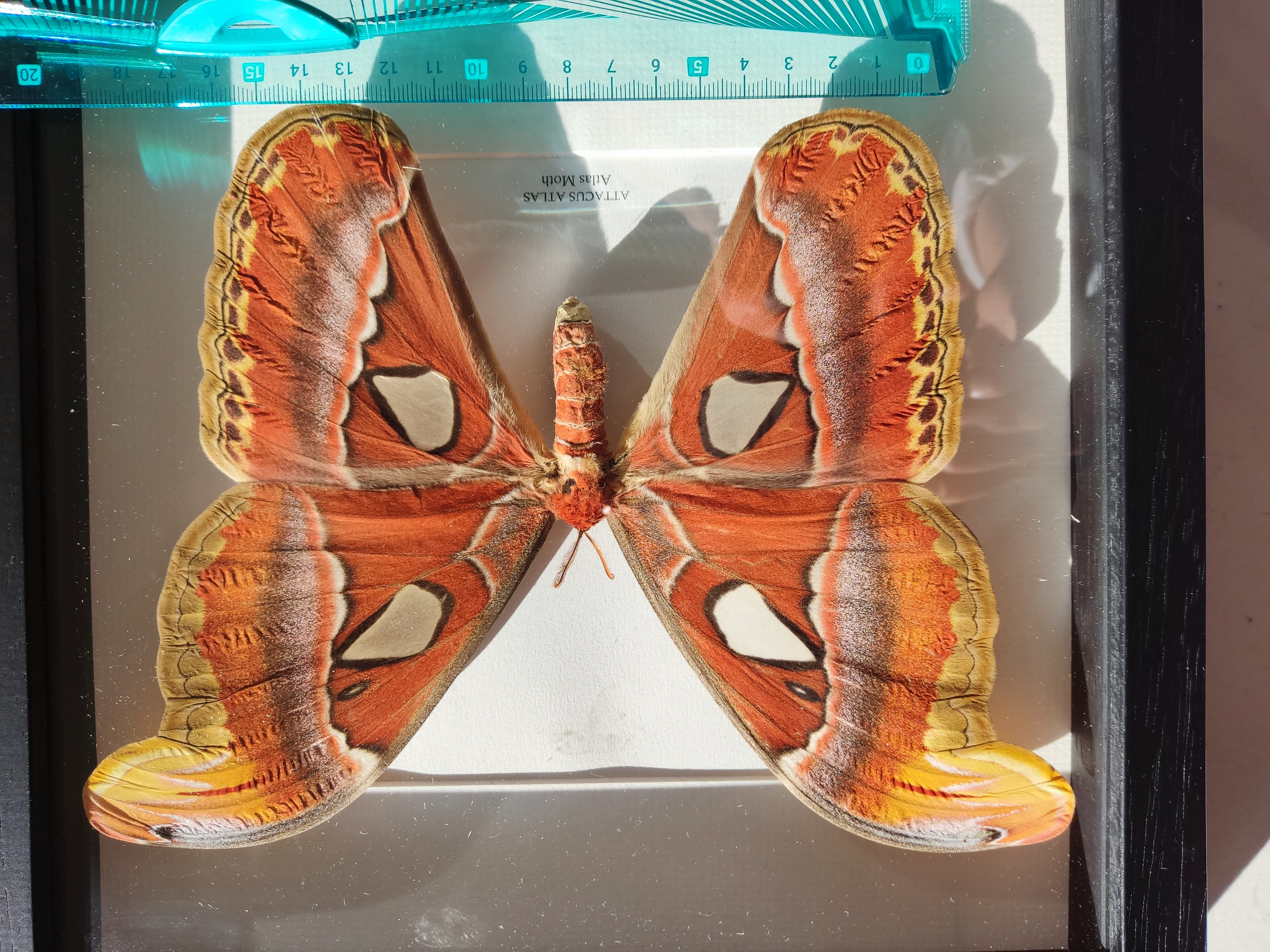 Attacus atlas (fam. Saturniidae) é uma das maiores mariposas do mundo, endémica das florestas do Sul e Sudeste da Ásia, podendo atingir cerca de 24 cm de envergadura alar. O corpo é relativamente curto quando comparado com as asas amplas e bem desenvolvidas. O nome vulgar mariposa-cabeça-de-cobra deve-se às extensões proeminentes das asas anteriores, que mimetizam a cabeça de uma serpente e podem ser movimentadas como estratégia defensiva para afugentar predadores. A espécie apresenta dimorfismo sexual evidente: as fêmeas são maiores e mais pesadas, enquanto os machos possuem antenas mais largas e plumosas, adaptadas à deteção de feromonas. A presente fotografia retrata uma fêmea, integrada na Exposição Três Mundos, Uma Casa – Plantas, Insetos, Humanos, com curadoria de Luís Mendonça de Carvalho, patente no Edifício 51 da Fábrica da Pólvora de Barcarena, em Oeiras, entre 22 de novembro de 2025 e 17 de fevereiro de 2026. A borboleta, seca e montada, provém de uma quinta tailandesa, onde estes insetos são criados, e, pertence a um subconjunto das borboletas comercializadas para atividades educativas. As fêmeas ovipõem na página inferior das plantas hospedeiras. O ciclo de vida é de metamorfose completa. Após cerca de 14 dias, as lagartas eclodem e alimentam-se de folhas. Quando atingem aproximadamente 11 cm de comprimento, constroem o casulo; a emergência do adulto ocorre cerca de um mês depois. Os adultos não possuem peças bucais funcionais e vivem das reservas de gordura acumuladas durante a fase larvar. São predominantemente noctívagos, repousando durante o dia. As fêmeas permanecem próximas do local de emergência e libertam feromonas sexuais, detetadas pelos machos através dos quimiorrecetores das antenas. A fase adulta dura geralmente uma a duas semanas; após o acasalamento e a postura dos ovos, a fêmea morre.