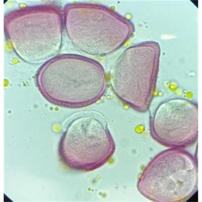 Agapanthus africanus, uma espécie da família Amaryllidaceae, produz grãos de pólen com diâmetros de 50 a 80 μm, dependendo do grau de hidratação, de forma oblato-esferoidal (quase redonda) em vista polar e oblata (achatada) em vista equatorial, de simetria radial, monossulcado, i.e. com uma abertura alongada em forma de colpo (sulco), com membrana lisa (psilada). A cor é amarela-acastanhada, na fotografia a cor rosa deve-se à coloração com fucsina. Os grãos apresentam, à superfície, uma mistura lipídica que promove a aderência aos insetos polinizadores. A preparação definitiva de grãos de pólen foi realizada durante uma sessão de trabalho no Clube de Ciência Viva da Escola Secundária Luís de Freitas Branco, com os alunos membros do clube, e observada ao microscópio ótico composto com ampliação de 1000 vezes.