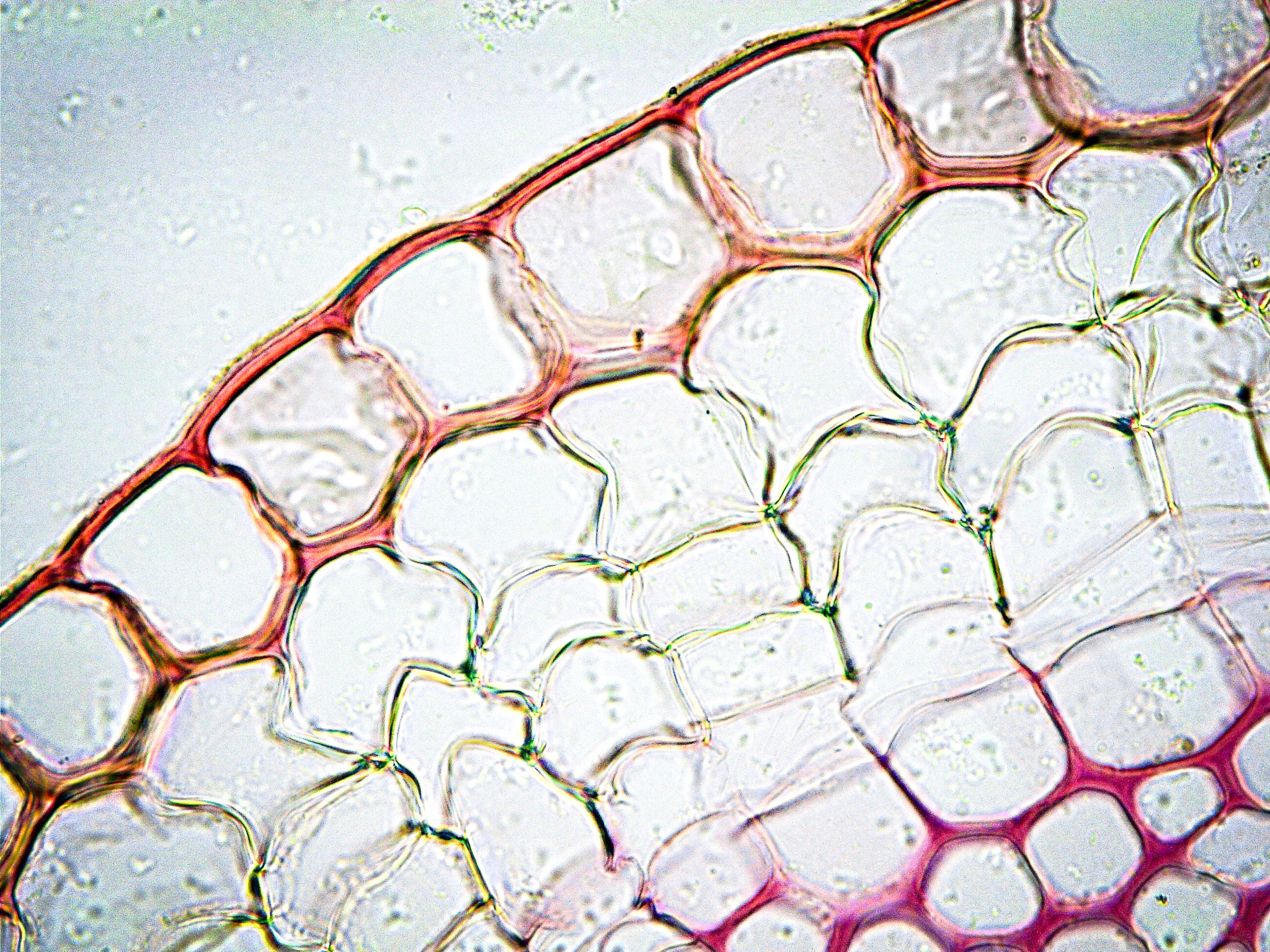 Corte transversal mostrando o início da formação de uma periderme na região subepidérmica de um caule de Sambucus nigra.