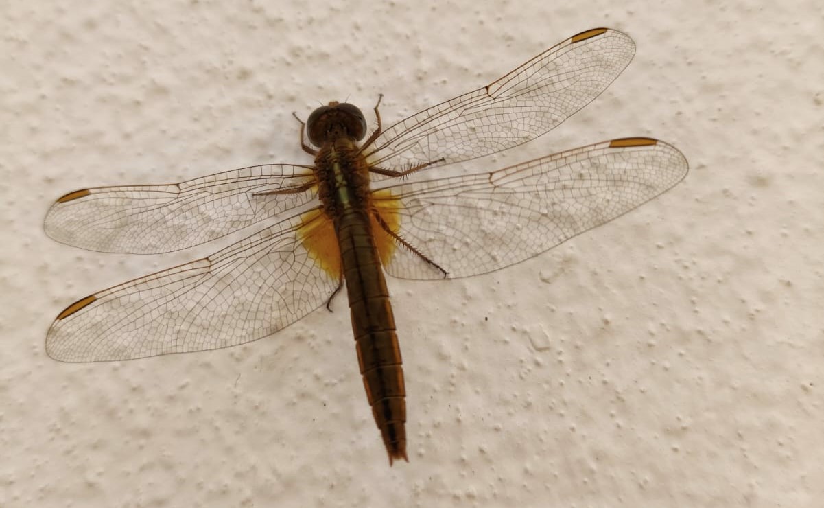 Na base das asas posteriores, possui uma mancha cor de âmbar. Trata-se de uma espécie carnívora, alimentando-se de insetos, muitos dos quais nocivos para o ser humano. Os indivíduos adultos podem atingir os 40 mm de comprimento. A fotografia foi captada em quintal de habitação, evidenciando-se que é possível ter acesso a apontamentos muito interessantes no que concerne à biodiversidade em meio urbano, nomeadamente da Classe Insecta.