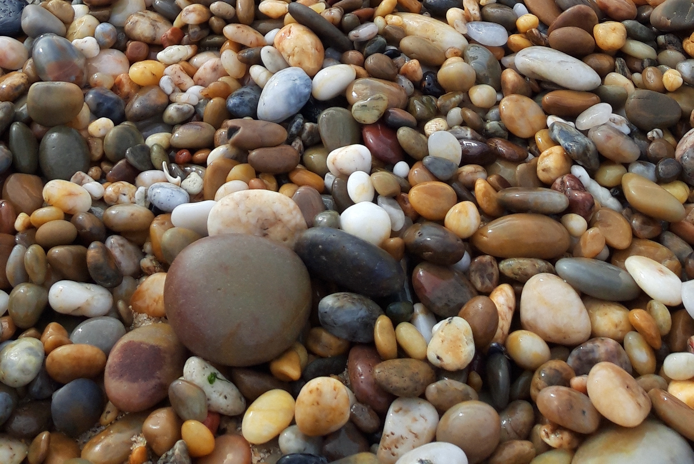 Calhaus rolados de dimensões variáveis em que o transporte e a sedimentação foi feita pelo mar, sendo observável o arredondamento típico associado ao referido tipo de transporte.