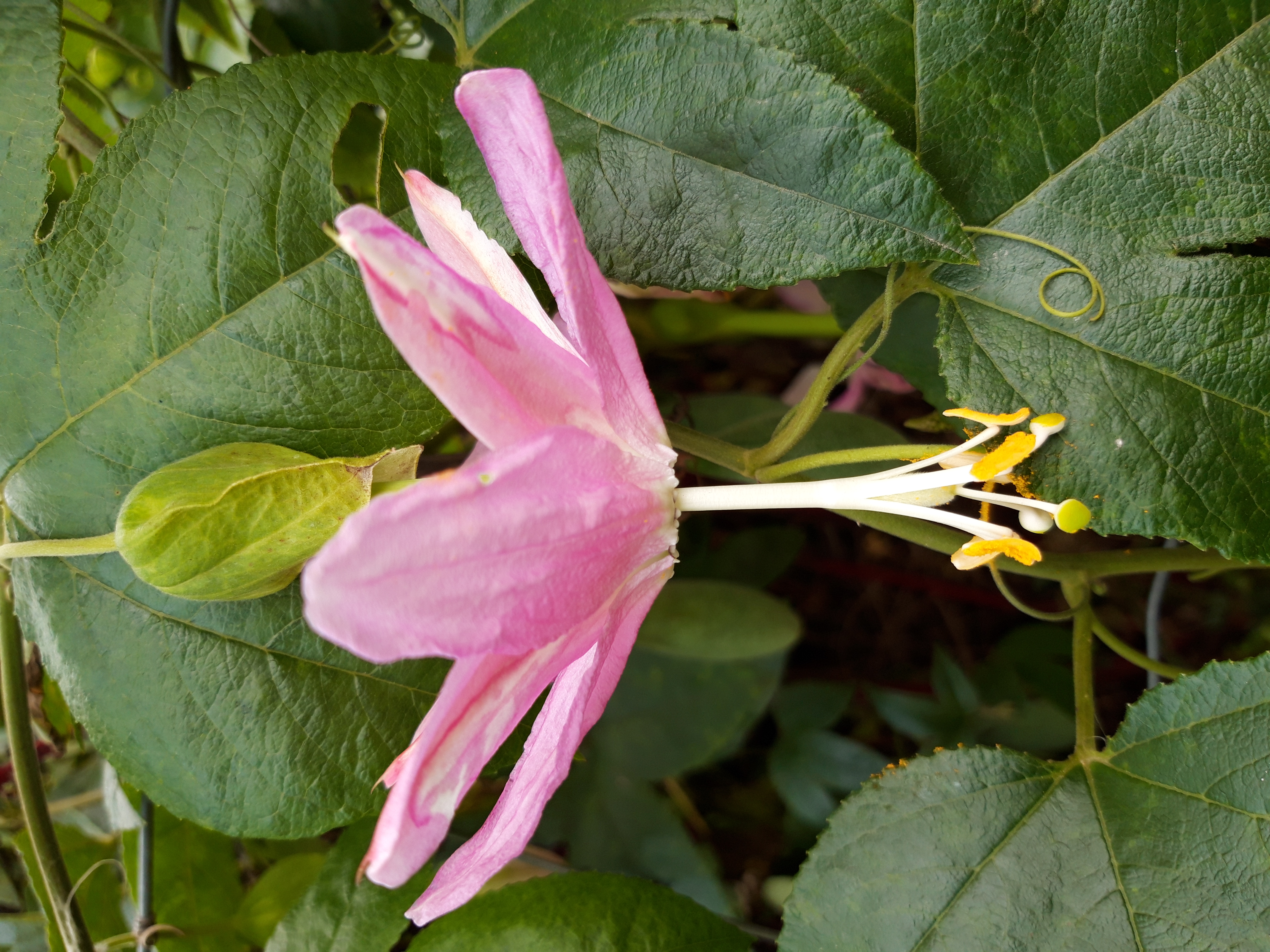 Flor de maracujá-banana, sendo visível a corola rosa, o gineceu e o androceu. A planta, nativa da América Central e América do Sul, inclui as espécies Passiflora molissima, Passiflora tarminiana e Passiflora tripartita. Planta trepadeira, com gavinhas. Fruto semelhante a uma pequena banana com bordos curvos.