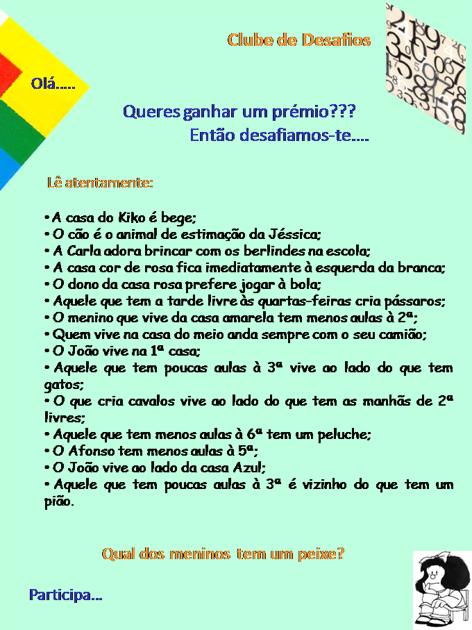 O João, a Carla, o Kiko, o Afonso e a Jéssica pertencem ao Clube dos Desafios da Escola. No dia do Pi (14/03) colaram cartazes pela escola com um quebra-cabeças que a professora os ajudou a escrever. O quebra-cabeças dá-nos informações sobre a cor da casa, o brinquedo preferido, o dia da semana com menos aulas e o animal de estimação dos cinco colegas.