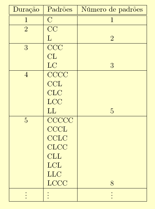 Por exemplo, o padrão CCLLCCL tem a duração 1+1+2+2+1+1+2=10: |CCLLCCL