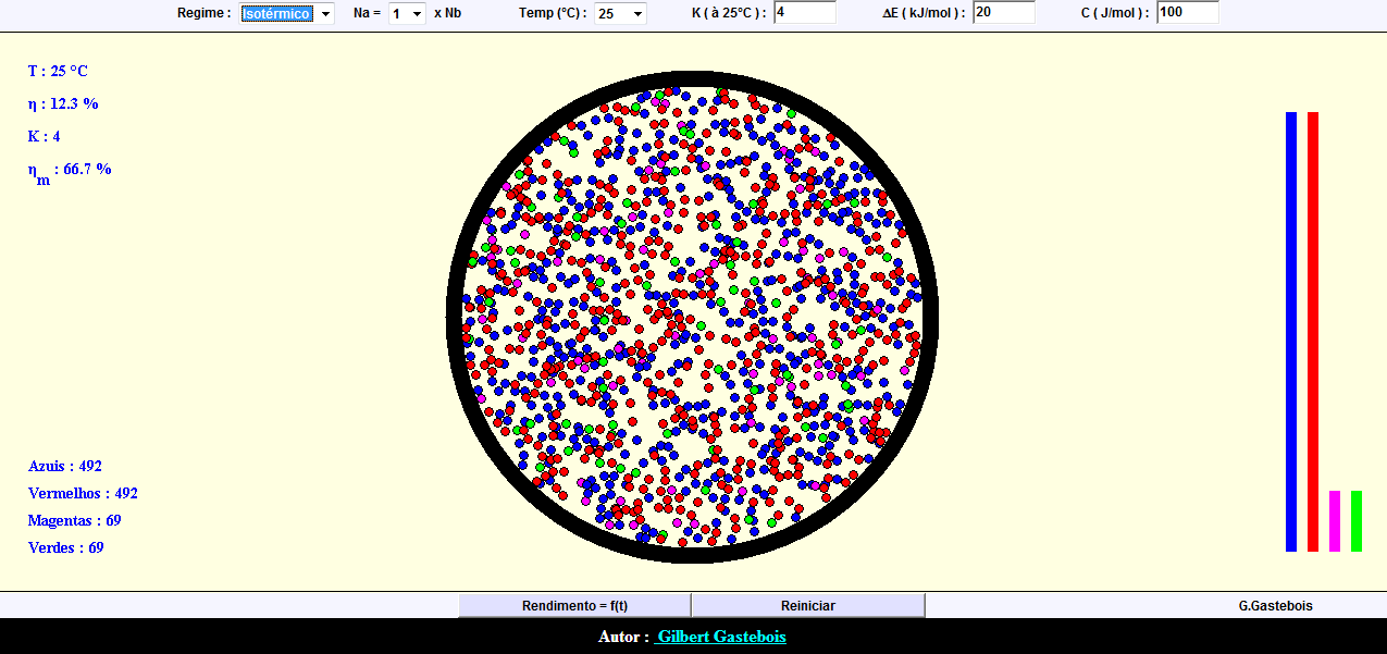 Trata-se de um applet que simula, ao nível microscópico a interação entre partículas numa reação química. As caixas de texto existentes no topo da animação, permitem ao utilizador controlar os valores da constante de reação (K), energia de reação (?E), o calor específico molar da mistura (C), a temperatura da reação (valores controlados entre -25ºC e 115ºC), o regime (adiabático ou isotérmico) e ainda a proporção entre o número de moles dos dois reagentes, (através de Na = (1, 2, 3, 4 ou 5 ) Nb). No fundo do applet, existem dois botões, um dos quais permite reiniciar a reação e o outro permite ver a evolução do rendimento da reação. O applet é acompanhado de um texto de apoio teórico de inegável qualidade que se encontra mais vocacionado para o Ensino Superior ou como complemento de formação para os professores.