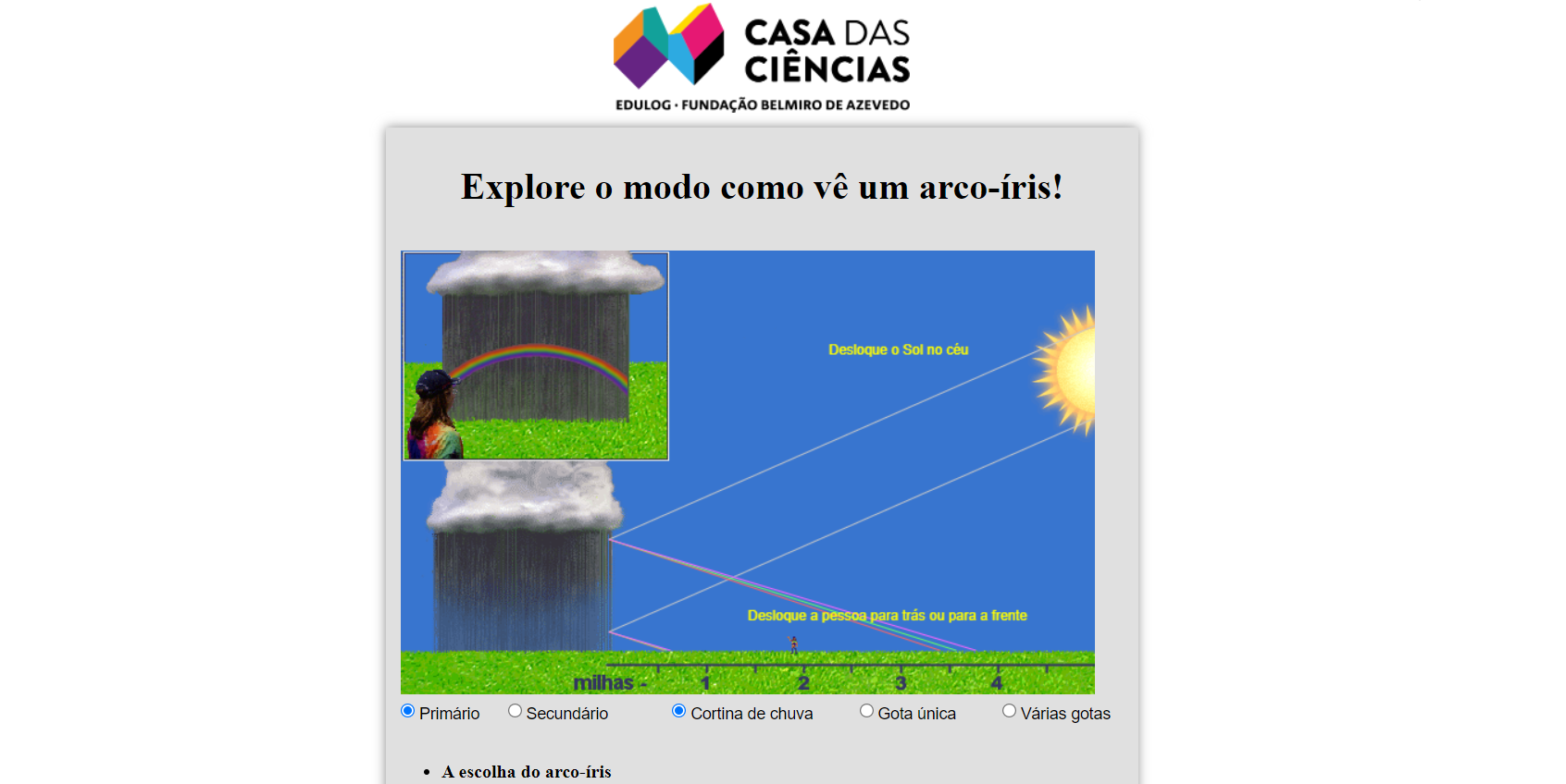 Aplicação interativa que permite explorar o modo como um observador vê um arco-íris. O utilizador pode optar por ver um arco-íris primário ou secundário; pode alternar entre três modos de visualização (cortina de chuva, gota única ou várias gotas); pode ainda alterar a posição do Sol e do observador.